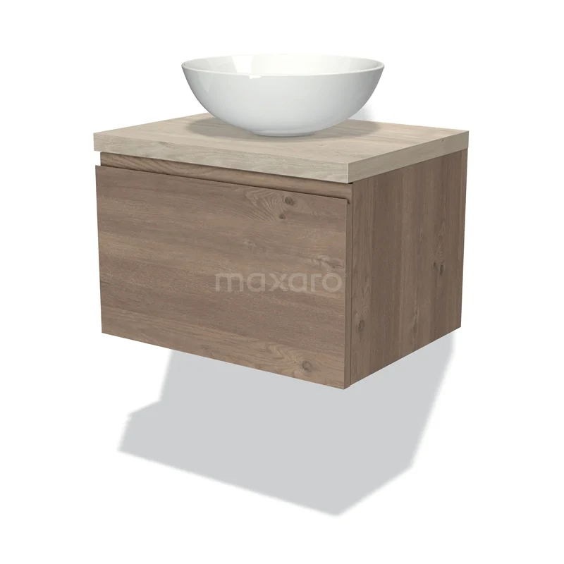 Badmöbel für Aufsatzwaschbecken 60cm Modulo Plato mittelbraune Eiche 1 Schublade grifflos hellgraue Eiche Platte