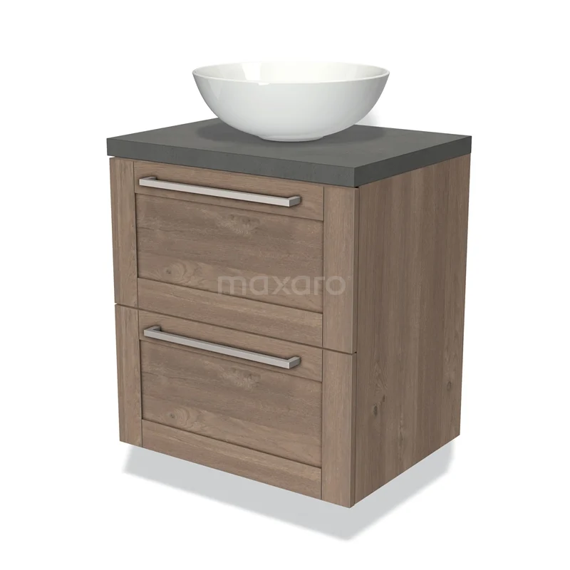 Badmöbel für Aufsatzwaschbecken 60cm Modulo Plato mittelbraune Eiche 2 Schubladen Rahmen dunkelgrauer Beton Platte