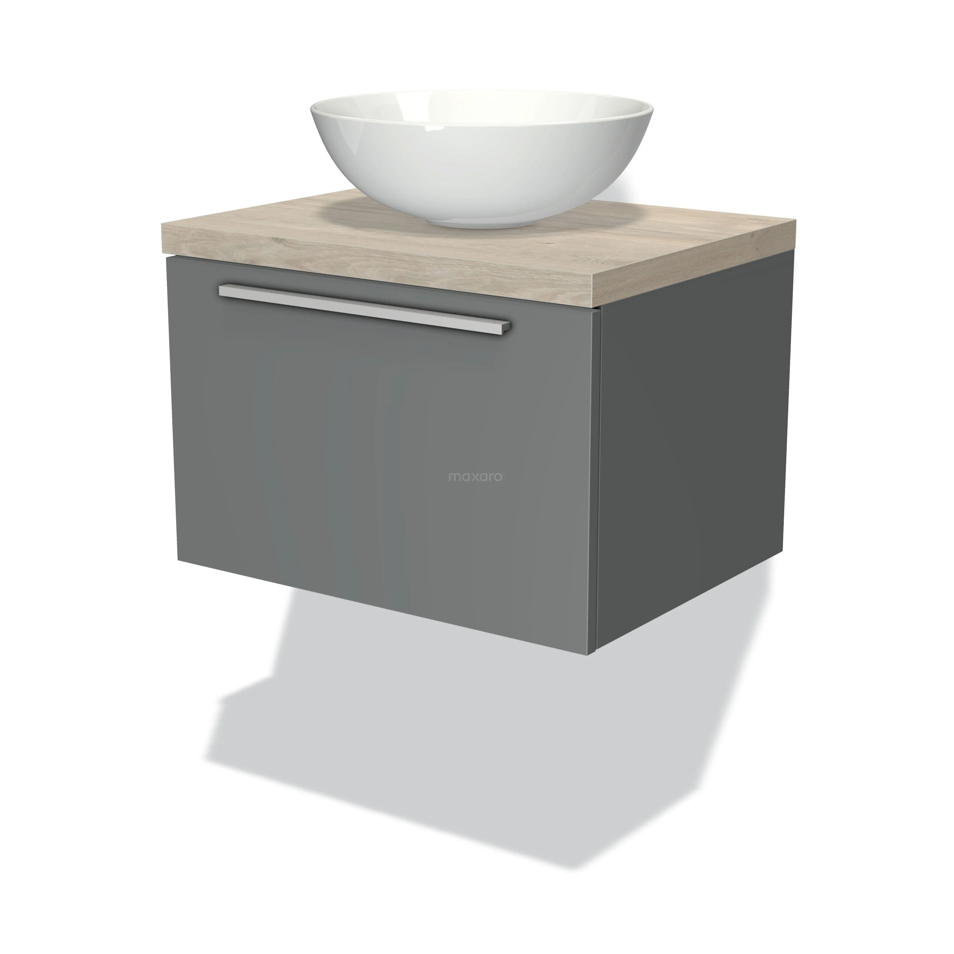 Badmöbel für Aufsatzwaschbecken 60cm Modulo Plato Mittelgrau 1 Schublade Flach hellgraue Eiche Platte