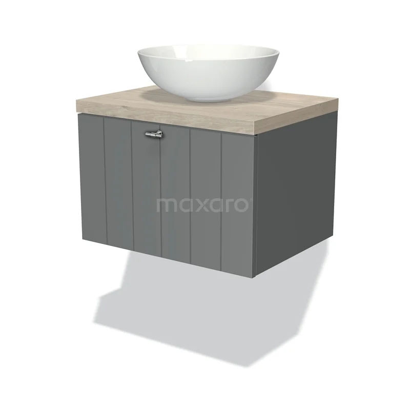 Badmöbel für Aufsatzwaschbecken 60cm Modulo Plato Mittelgrau 1 Schublade Lamelle Hellgraue Eiche Platte