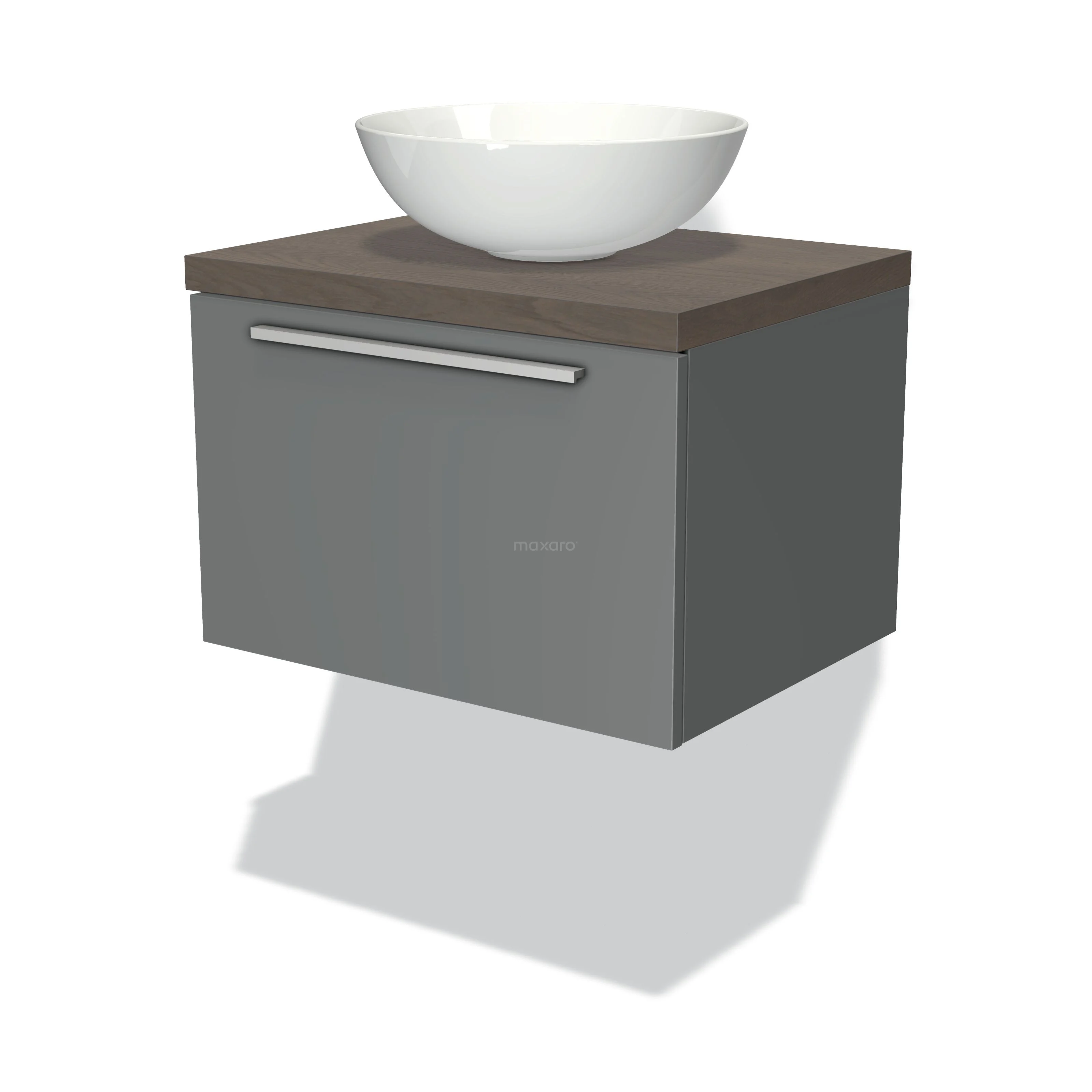 Badmöbel für Aufsatzwaschbecken 60cm Modulo Plato Mittelgrau 1 Schubladen Flach Dunkelbraune Eiche Platte