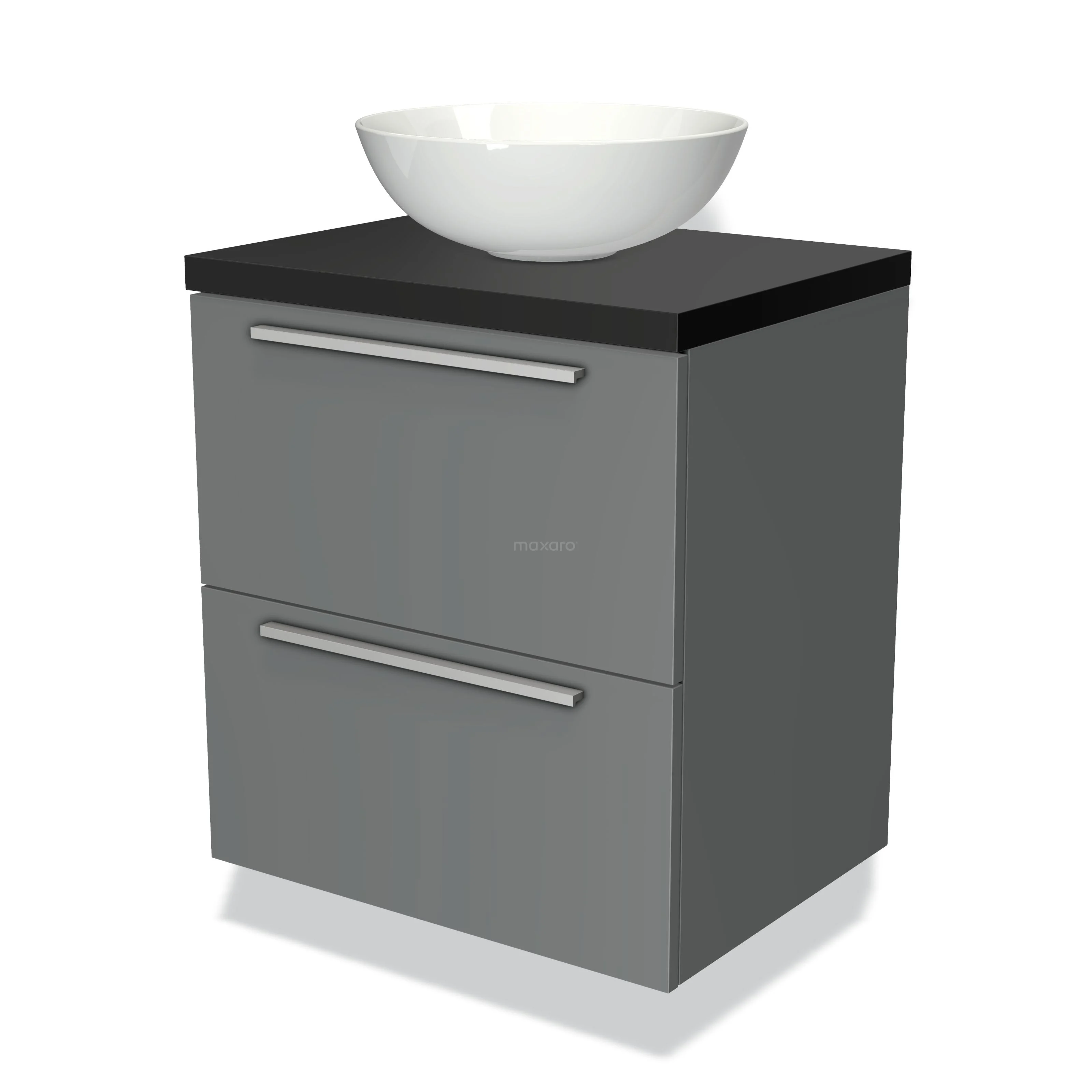 Badmöbel für Aufsatzwaschbecken 60cm Modulo Plato Mittelgrau 2 Schubladen Flach Matt Schwarz Platte