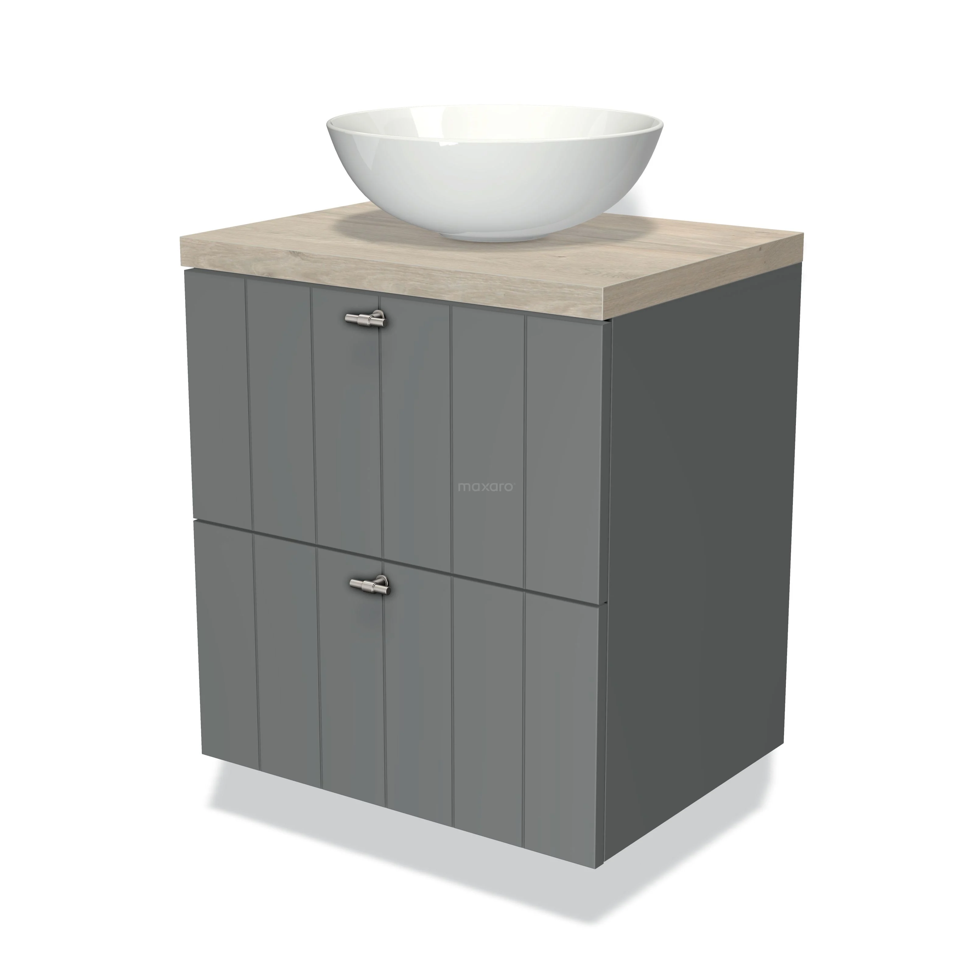 Badmöbel für Aufsatzwaschbecken 60cm Modulo Plato Mittelgrau 2 Schubladen Lamelle Hellgraue Eiche Platte
