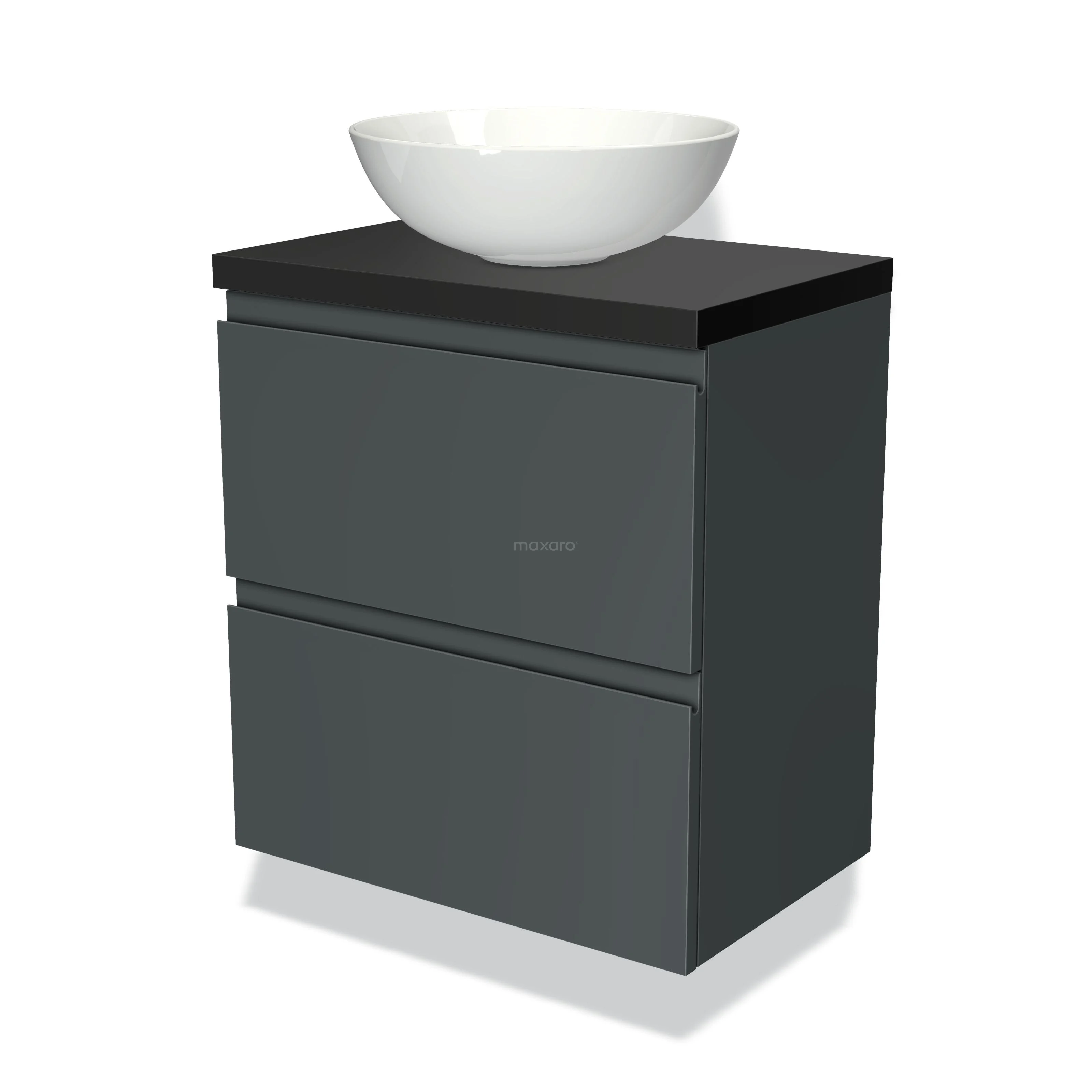 Modulo Plato Slim Badmöbel mit Aufsatzwaschbecken | 60 cm Dunkelgrau Grifflos front Matt Schwarz blatt 2 übereinanderliegende Schubladen