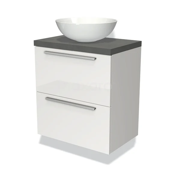 Modulo Plato Slim Badmöbel mit Aufsatzwaschbecken | 60 cm Hochglanz Weiß Flach front Dunkelgrauer Beton blatt 2 übereinanderliegende Schubladen