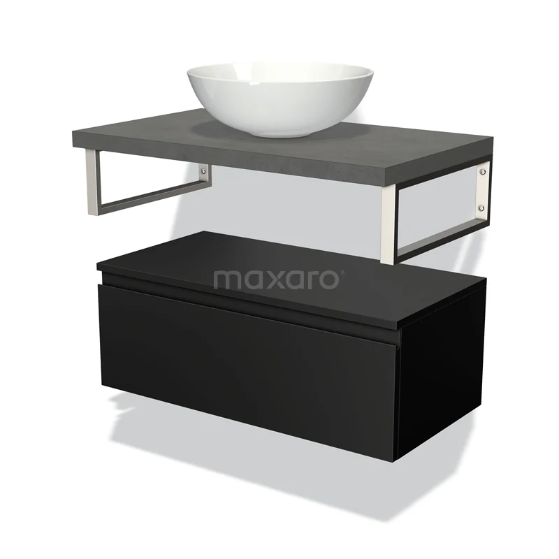 Modulo Plato Badmöbel mit Aufsatzwaschbecken | 80 cm Matt Schwarz Grifflos front Dunkelgrauer Beton blatt Tief hängend