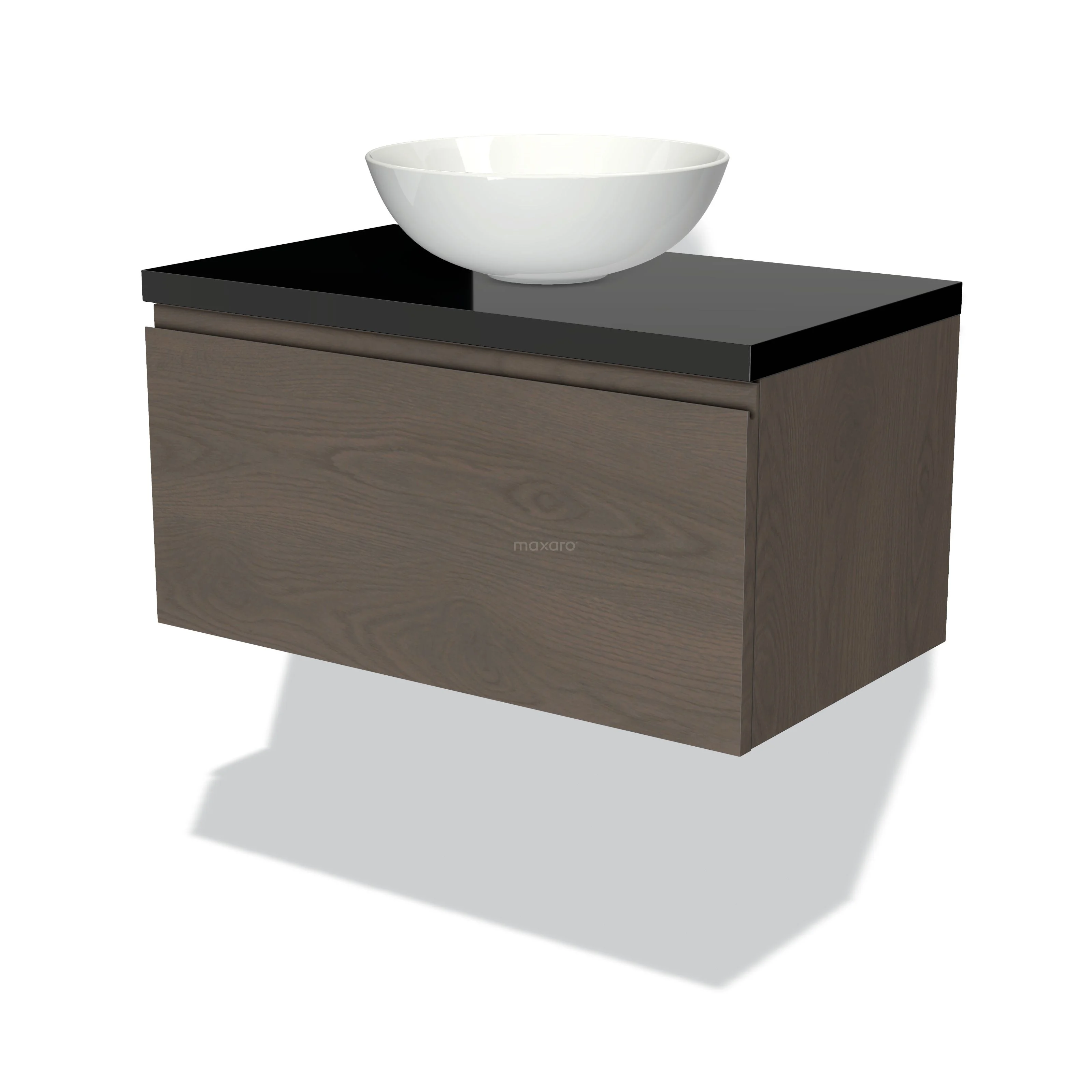 Badmöbel für Aufsatzwaschbecken 80cm Modulo Plato dunkelbraune Eiche 1 Schublade grifflos Hochglanz Schwarz Platte