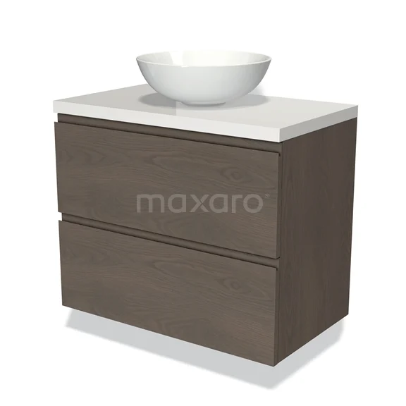 Badmöbel für Aufsatzwaschbecken 80cm Modulo Plato dunkelbraune Eiche 2 Schubladen grifflos Hochglanz Weiß Platte
