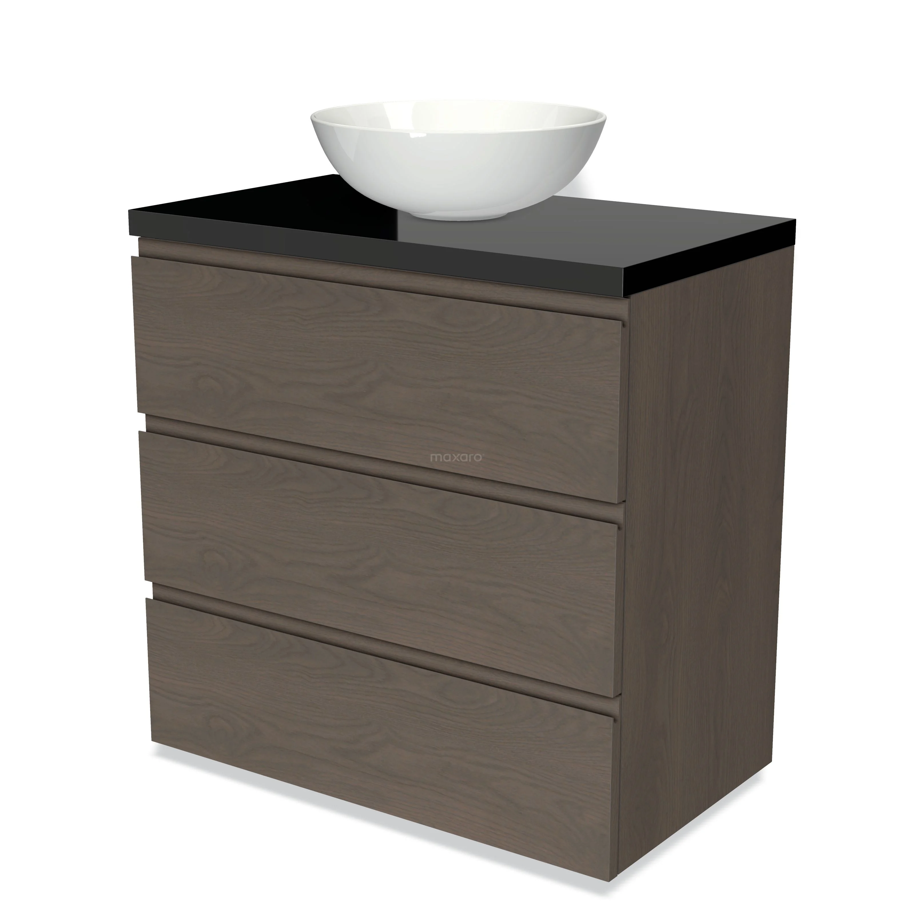Modulo Plato Badmöbel mit Aufsatzwaschbecken | 80 cm Dunkelbraune Eiche Grifflos front Hochglanz Schwarz blatt 3 Schubladen