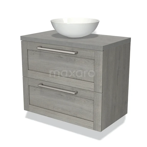 Badmöbel für Aufsatzwaschbecken 80cm Modulo Plato Grau Eiche 2 Schubladen Rahmen hellgrauer Beton Platte