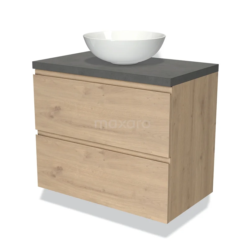 Modulo Plato Badmöbel mit Aufsatzwaschbecken | 80 cm Hellbraune Eiche Grifflos front Dunkelgrauer Beton blatt 2 übereinanderliegende Schubladen