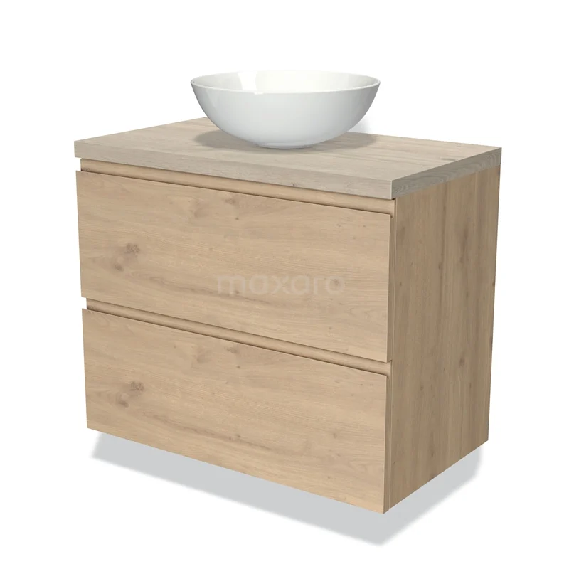 Badmöbel für Aufsatzwaschbecken 80cm Modulo Plato Hellbraune Eiche 2 Schubladen Grifflos Hellgraue Eiche Platte