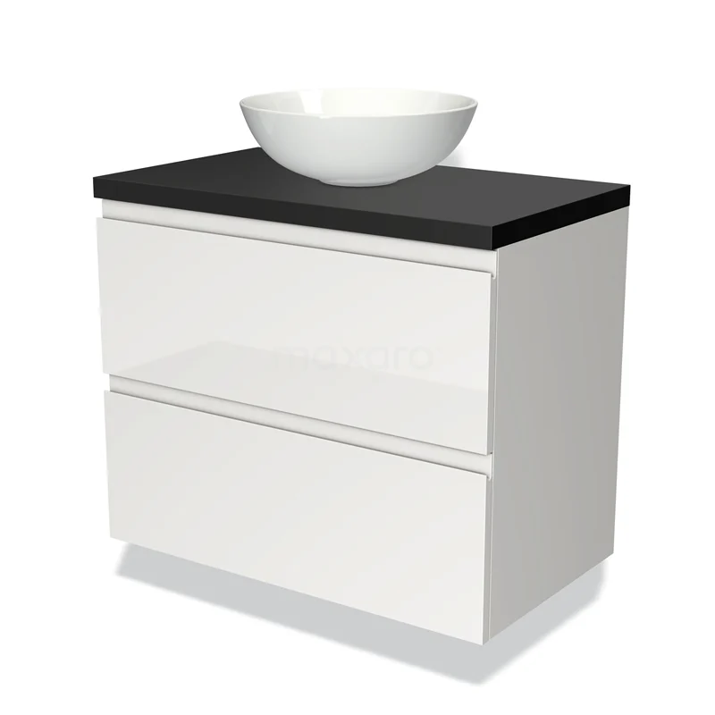 Badmöbel für Aufsatzwaschbecken 80cm Modulo Plato Hochglanz Weiß 2 Schubladen Grifflos Matt Schwarz Platte