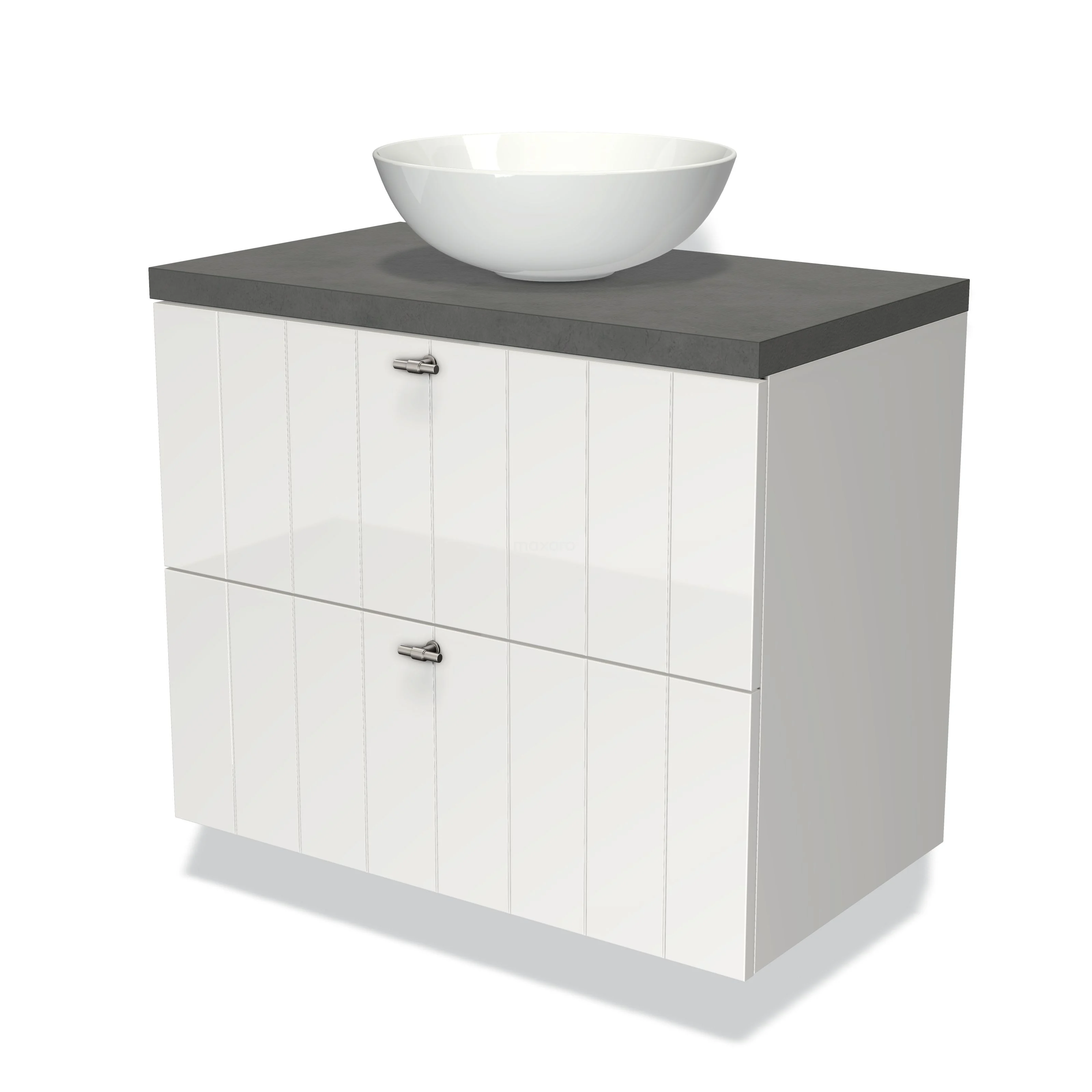Badmöbel für Aufsatzwaschbecken 80cm Modulo Plato Hochglanz Weiß 2 Schubladen Lamelle Dunkelgrau Beton Platte