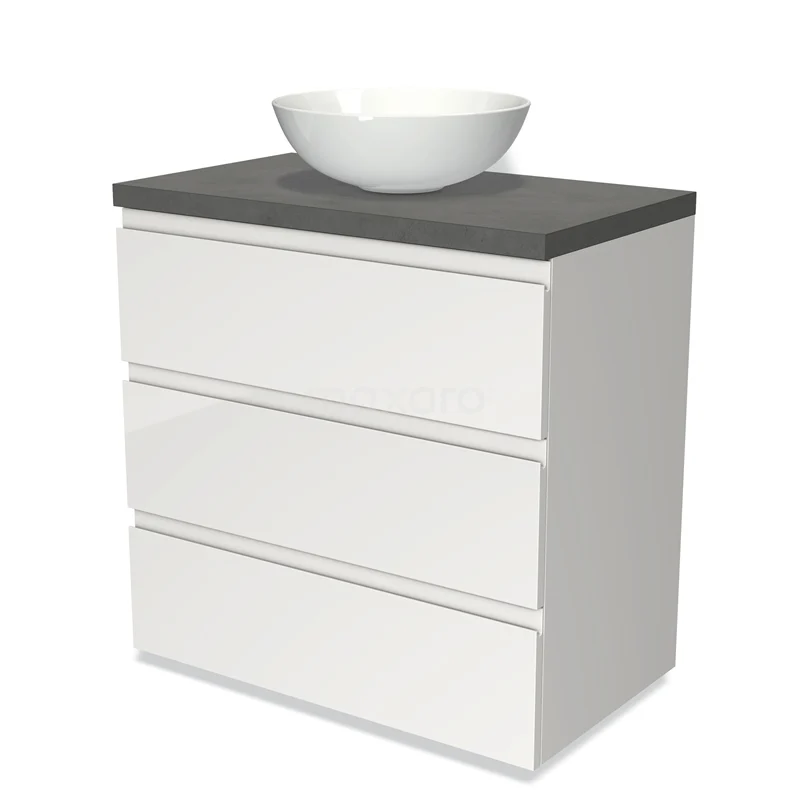 Badmöbel für Aufsatzwaschbecken 80cm Modulo Plato Hochglanz Weiß 3 Schubladen Grifflos Dunkelgrau Beton Platte