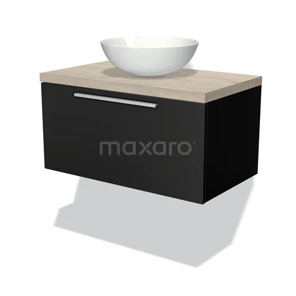 Badmöbel für Aufsatzwaschbecken 80cm Modulo Plato Matt Schwarz 1 Schublade Flach Hellgraue Eiche Platte