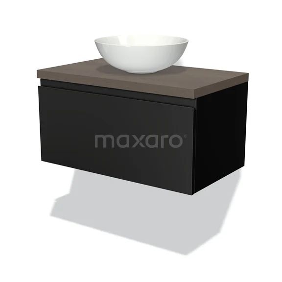 Badmöbel für Aufsatzwaschbecken 80cm Modulo Plato Matt Schwarz 1 Schublade grifflos dunkelbraune Eiche Platte