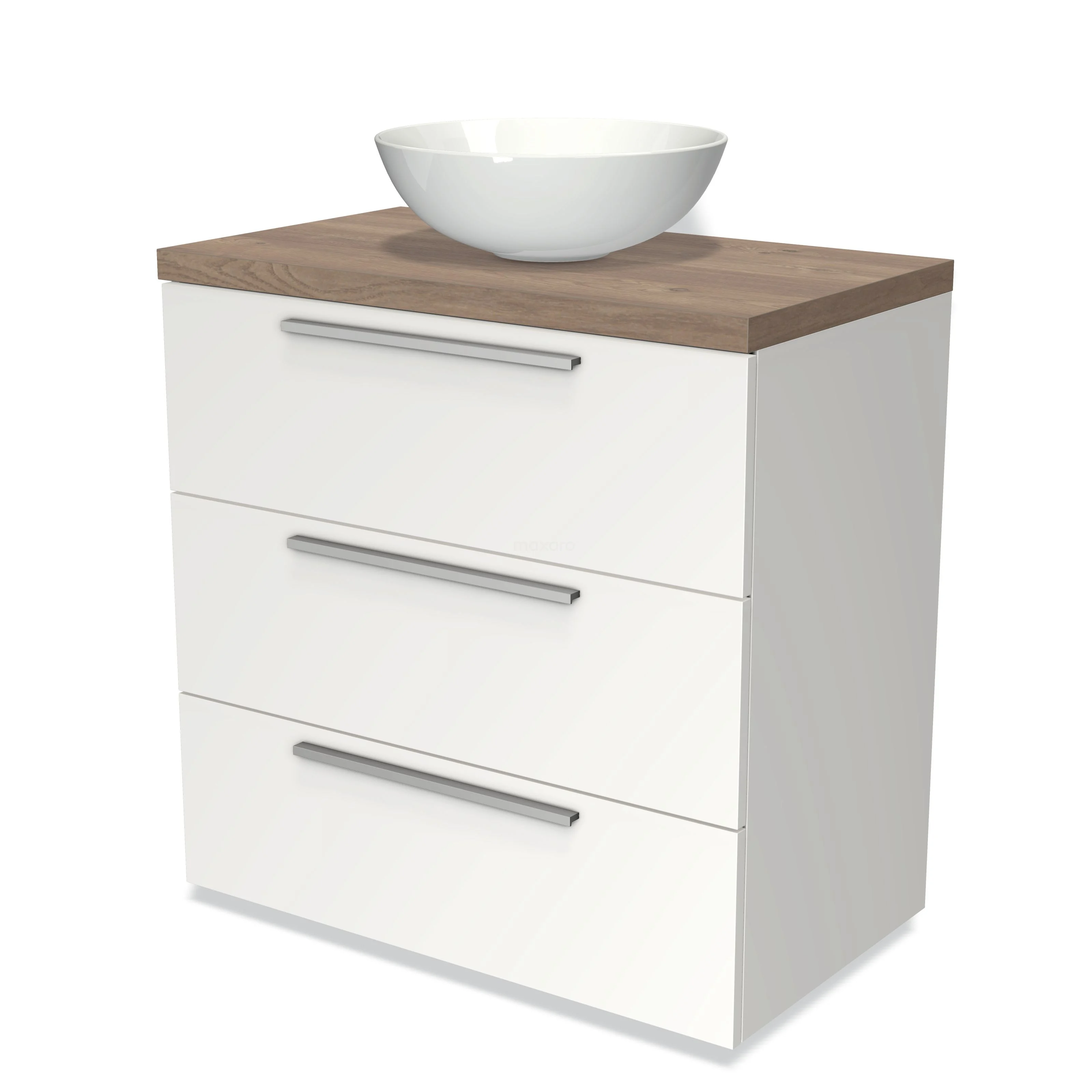 Badmöbel für Aufsatzwaschbecken 80cm Modulo Plato Matt Weiß 3 Schubladen Flach Mittelbraune Eiche Platte