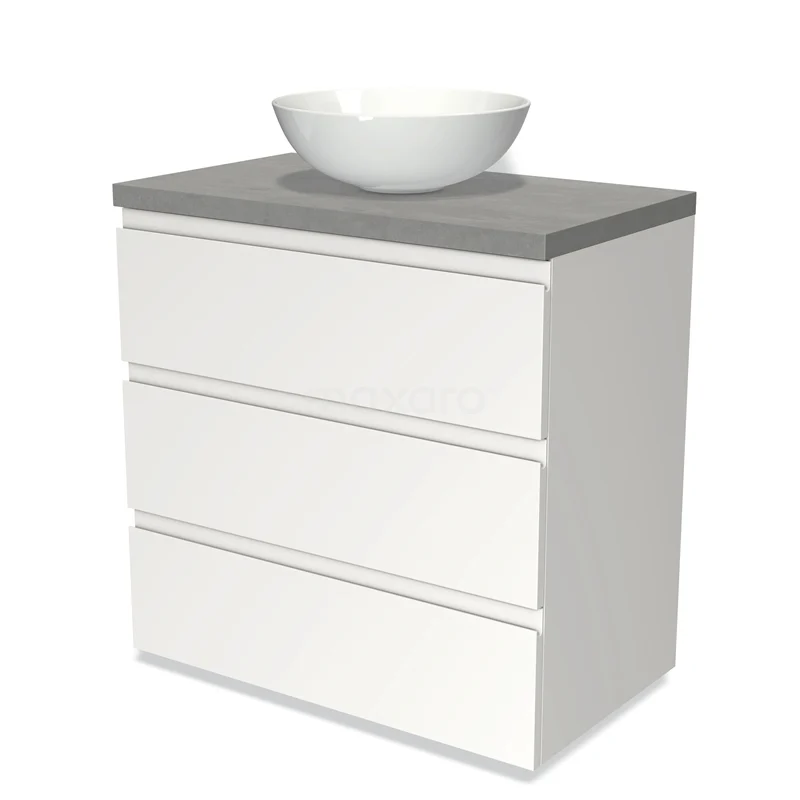 Badmöbel für Aufsatzwaschbecken 80cm Modulo Plato Matt Weiß 3 Schubladen Grifflos hellgrauer Beton Platte