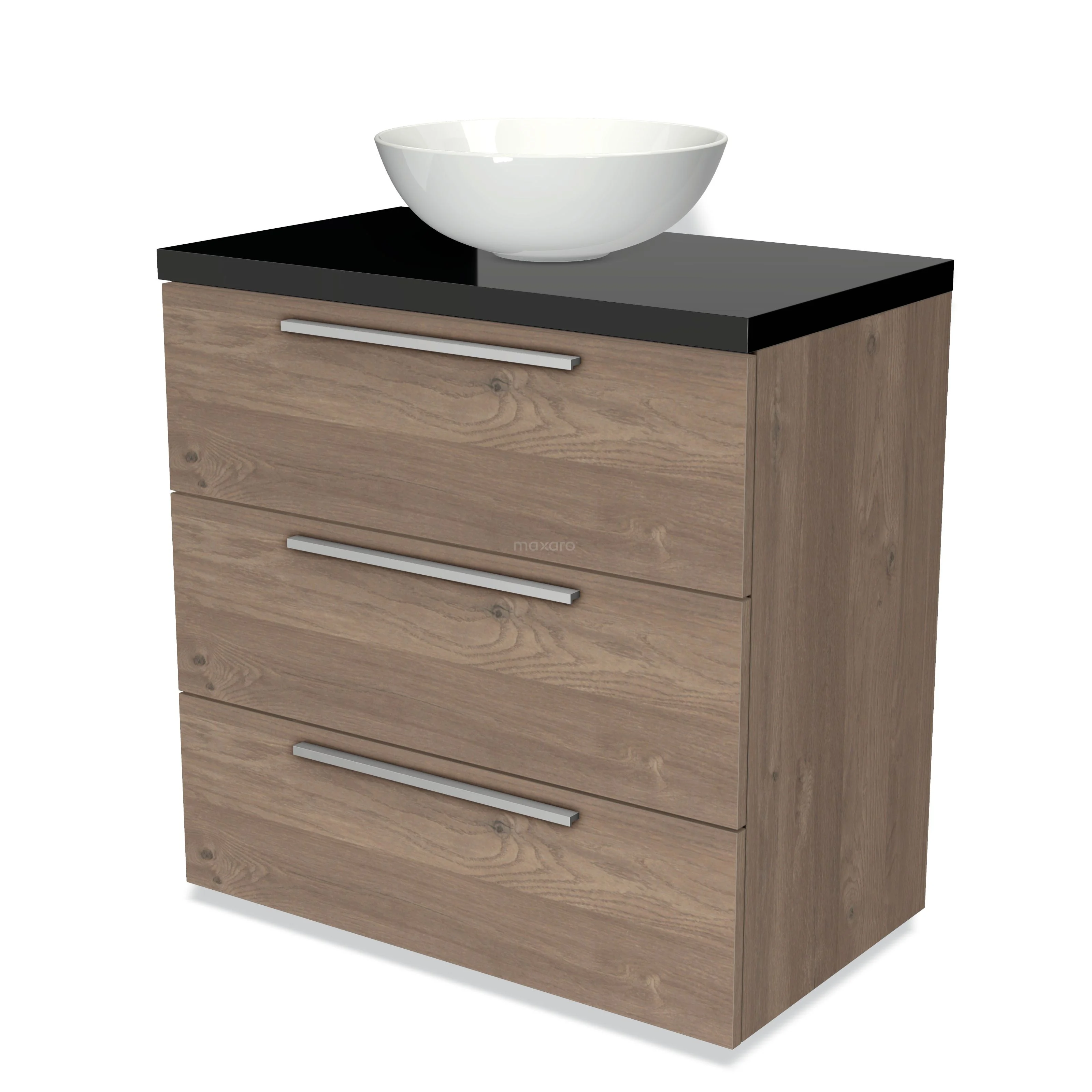 Badmöbel für Aufsatzwaschbecken 80cm Modulo Plato mittelbraune Eiche 3 Schubladen Flach Hochglanz Schwarz Platte