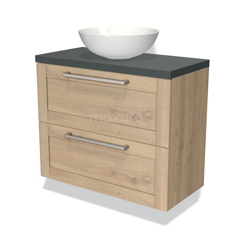 Modulo Plato Slim Badmöbel mit Aufsatzwaschbecken | 80 cm Hellbraune Eiche Rahmen front Dunkelgrau blatt 2 übereinanderliegende Schubladen