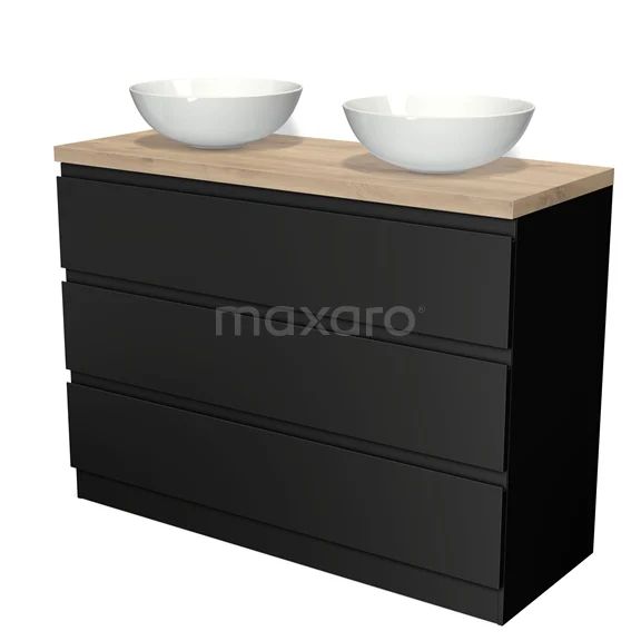 Badmöbel für Waschtischunterschrank 120cm Modulo Plato Matt Schwarz 3 Schubladen Grifflos Hellbraune Eiche Platte