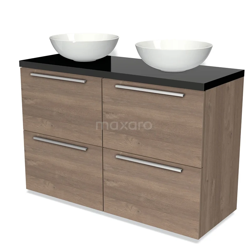 Badmöbel für Waschtischunterschrank 120cm Modulo Plato mittelbraune Eiche 4 hohe Schubladen Flach Hochglanz Schwarz Platte