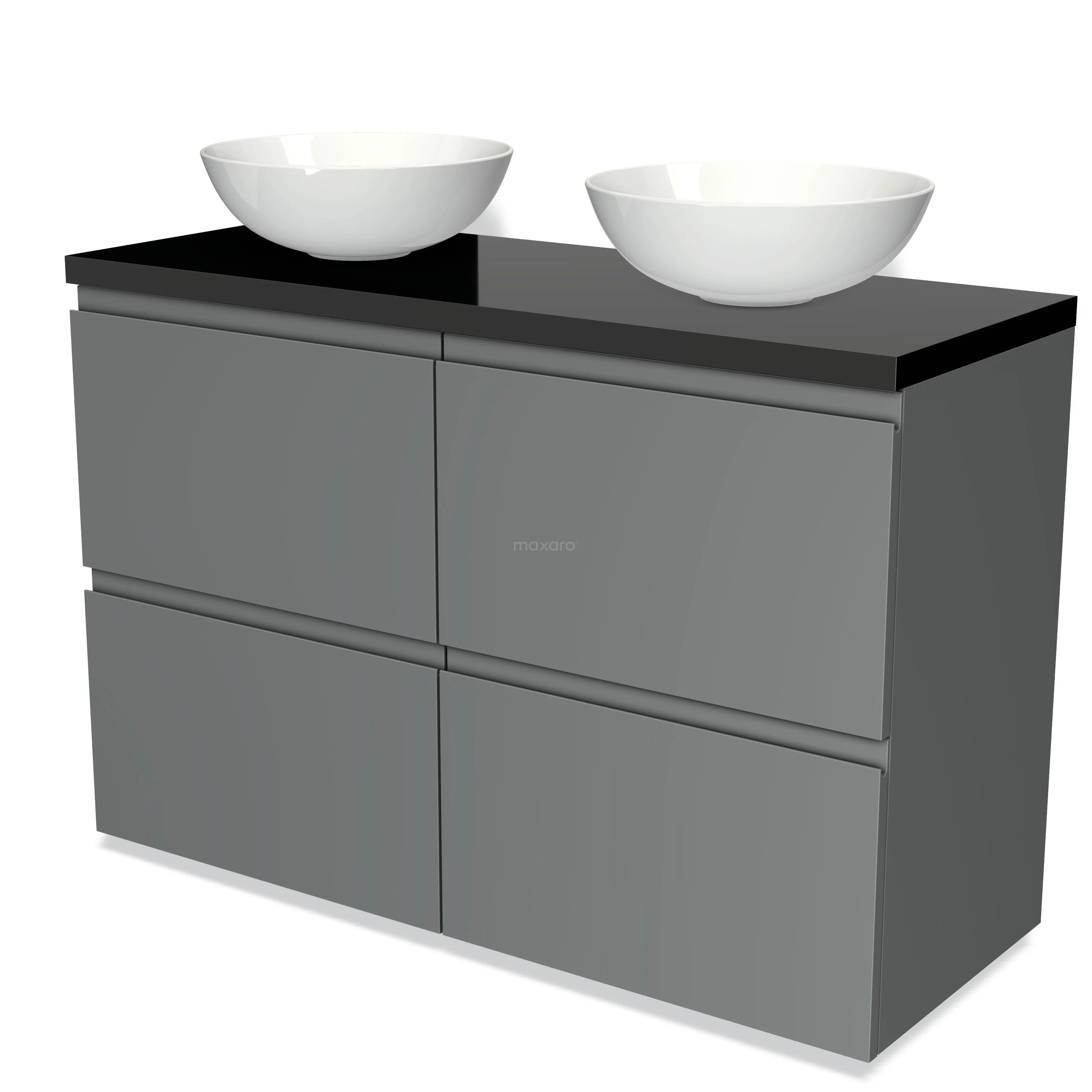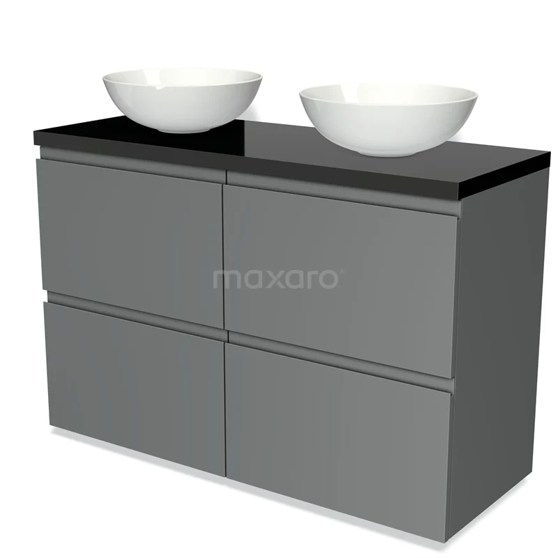 Modulo Plato Badmöbel mit Aufsatzwaschbecken | 120 cm Mittelgrau Grifflos front Hochglanz Schwarz blatt 4 hohe Schubladen