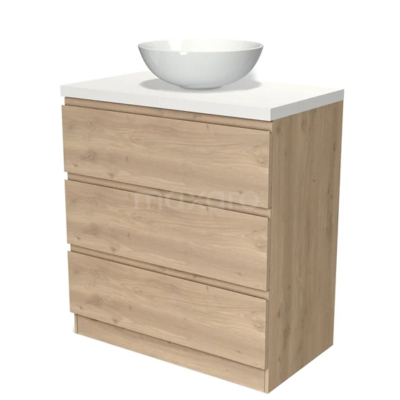 Modulo Plato Badmöbel mit Aufsatzwaschbecken | 80 cm Hellbraune Eiche Grifflos front Matt Weiß blatt 3 stehende Schubladen