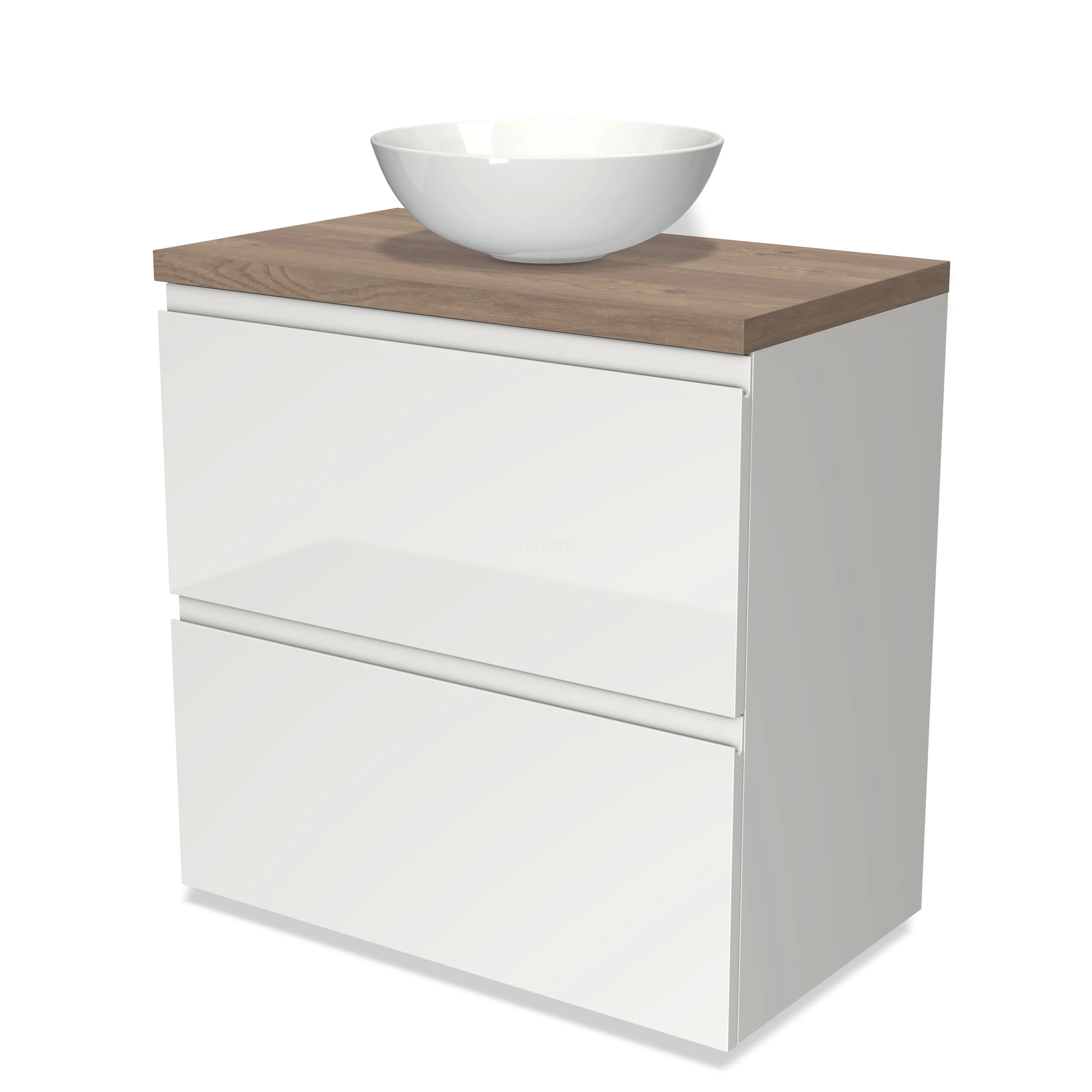 Badmöbel für Waschtischunterschrank 80cm Modulo Plato Hochglanz Weiß 2 hohe Schubladen Grifflos Mittelbraune Eiche Platte