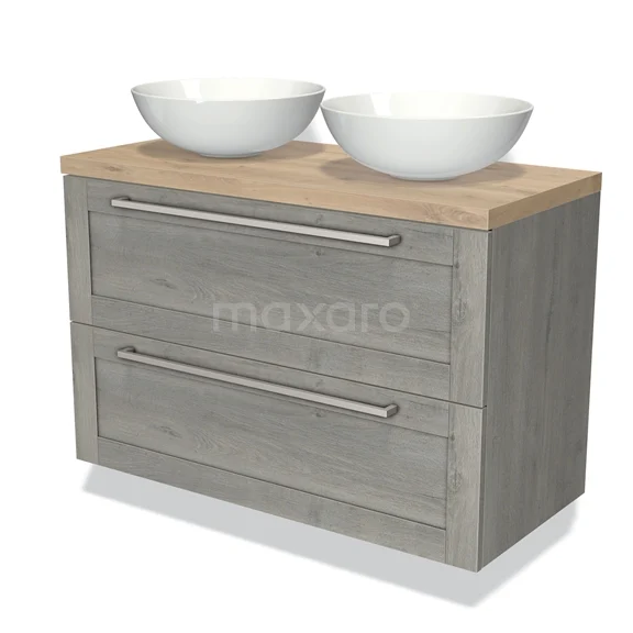 Badmöbel für Waschtischunterschrank mit Konsole 100cm Modulo Plato Grau Eiche 2 Schubladen Rahmen hellbraune Eiche Platte