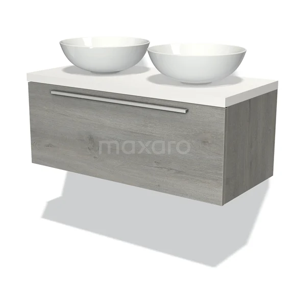 Badmöbel für Waschtischunterschrank mit Konsole 100cm Modulo Plato Graue Eiche 1 Schublade Flach Matt Weiß Platte