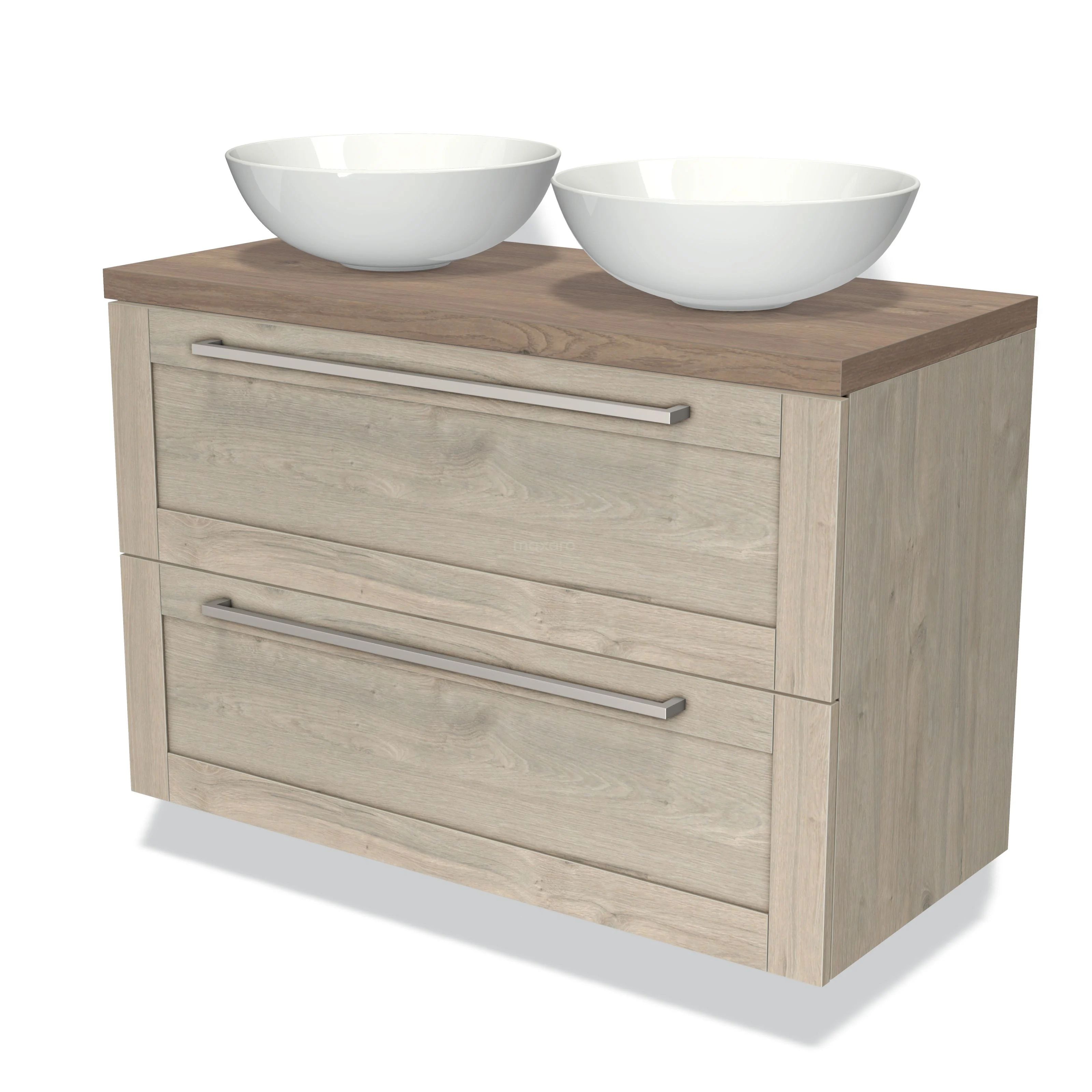 Badmöbel für Waschtischunterschrank mit Konsole 100cm Modulo Plato hellgraue Eiche 2 Schubladen Rahmen mittelbraune Eiche Platte