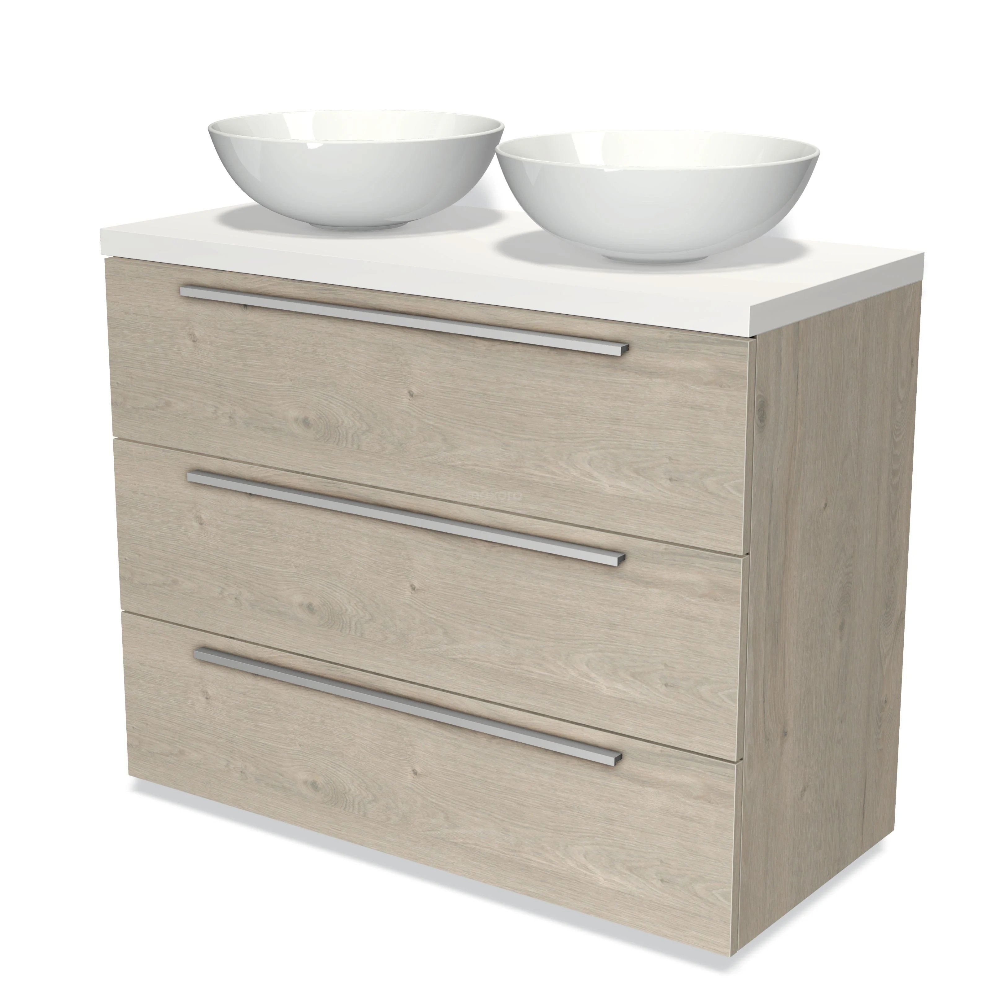 Badmöbel für Waschtischunterschrank mit Konsole 100cm Modulo Plato hellgraue Eiche 3 Schubladen Flach Matt Weiß Platte