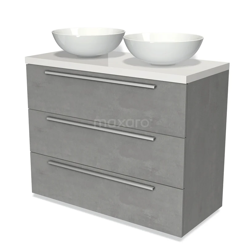Modulo Plato Badmöbel mit Aufsatzwaschbecken | 100 cm Hellgrauer Beton Flach front Hochglanz Weiß blatt 3 Schubladen