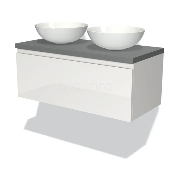 Badmöbel für Waschtischunterschrank mit Konsole 100cm Modulo Plato Hochglanz Weiß 1 Schublade Grifflos Mittelgrau Platte