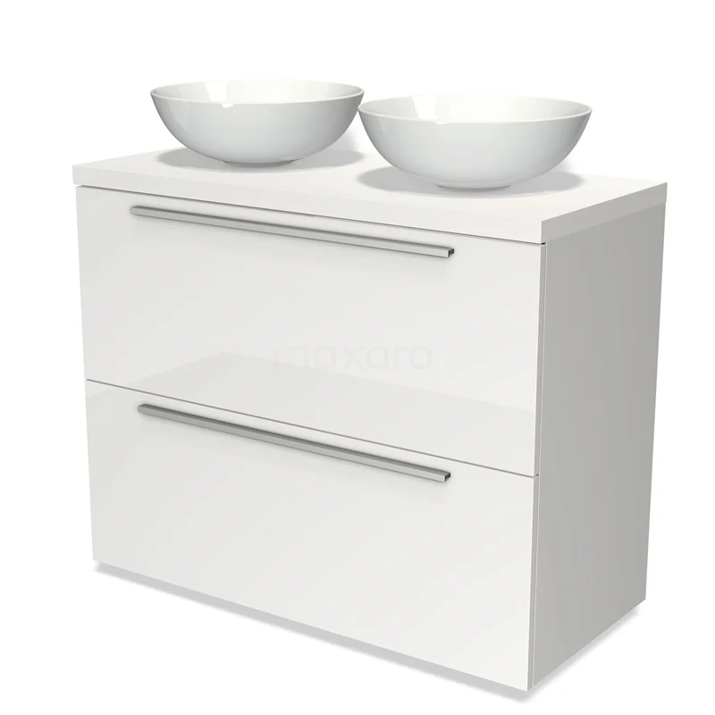 Badmöbel für Waschtischunterschrank mit Konsole 100cm Modulo Plato Hochglanz Weiß 2 hohe Schubladen Flach Matt Weiß Platte