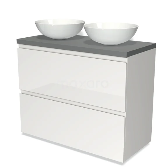 Badmöbel für Waschtischunterschrank mit Konsole 100cm Modulo Plato Hochglanz Weiß 2 hohe Schubladen Grifflos Mittelgrau Platte