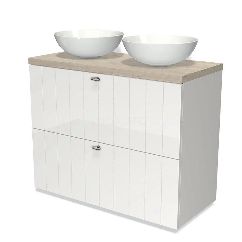 Badmöbel für Waschtischunterschrank mit Konsole 100cm Modulo Plato Hochglanz Weiß 2 hohe Schubladen Lamelle hellgraue Eiche Platte