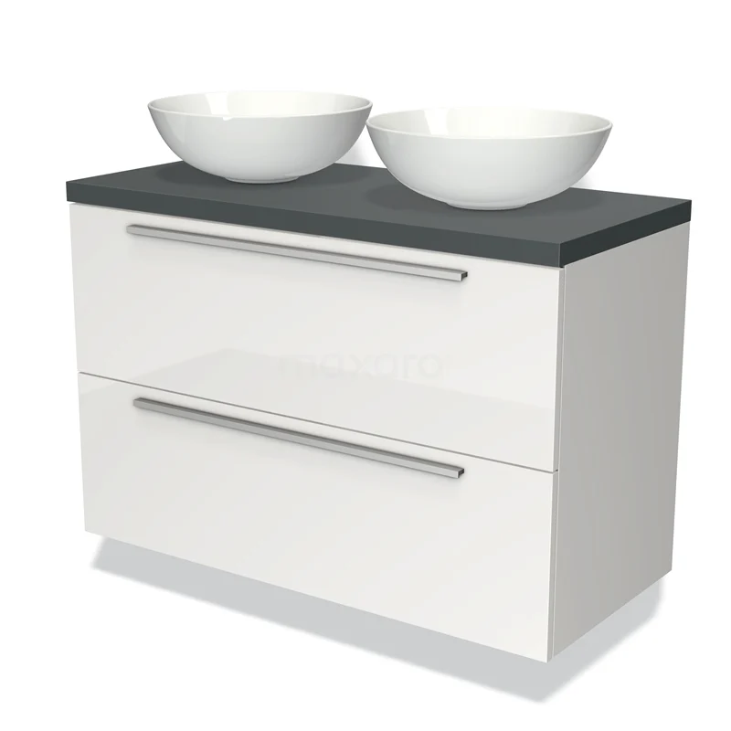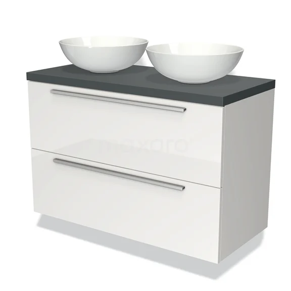 Badmöbel für Waschtischunterschrank mit Konsole 100cm Modulo Plato Hochglanz Weiß 2 Schubladen Flach Dunkelgrau Platte
