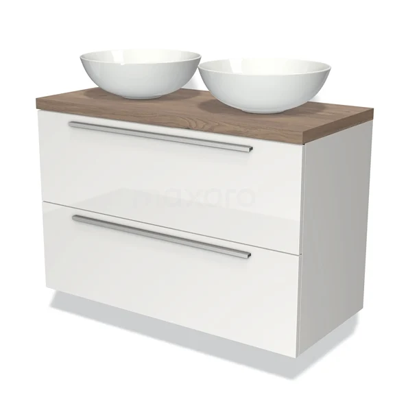 Badmöbel für Waschtischunterschrank mit Konsole 100cm Modulo Plato Hochglanz Weiß 2 Schubladen Flach mittelbraune Eiche Platte