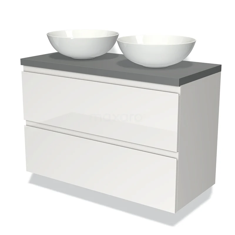 Badmöbel für Waschtischunterschrank mit Konsole 100cm Modulo Plato Hochglanz Weiß 2 Schubladen Grifflos Mittelgrau Platte