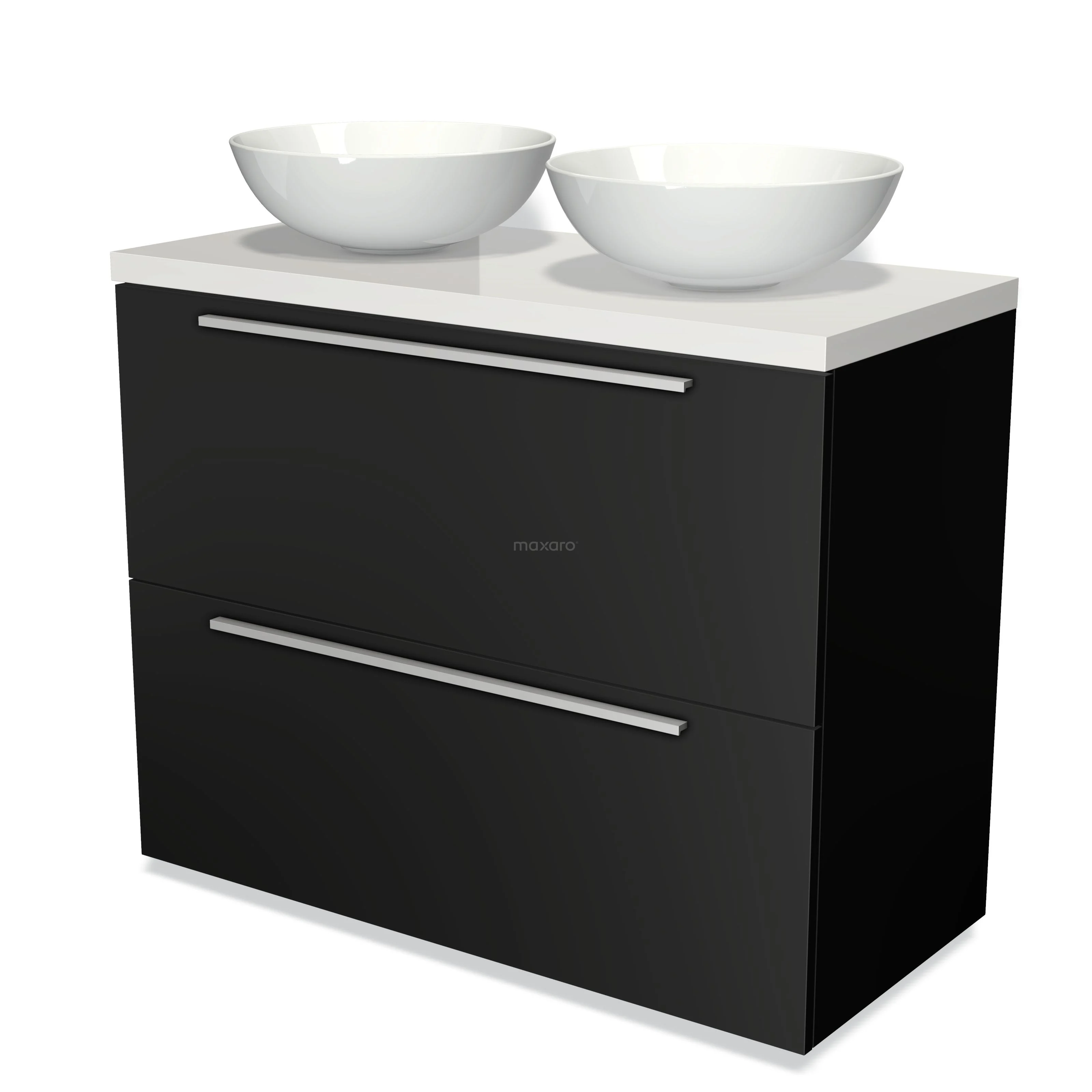 Badmöbel für Waschtischunterschrank mit Konsole 100cm Modulo Plato Matt Schwarz 2 hohe Schubladen Flach Hochglanz Weiß Platte
