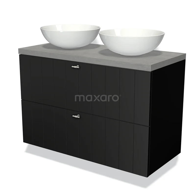 Badmöbel für Waschtischunterschrank mit Konsole 100cm Modulo Plato Matt Schwarz 2 Schubladen Lamelle hellgrauer Beton Platte