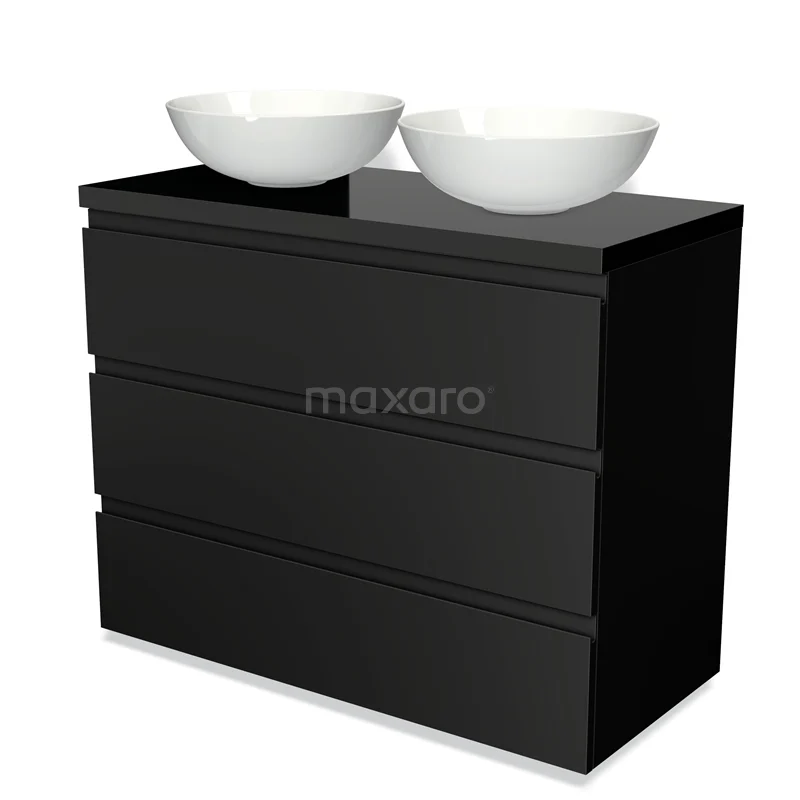 Badmöbel für Waschtischunterschrank mit Konsole 100cm Modulo Plato Matt Schwarz 3 Schubladen Grifflos Hochglanz Schwarz Platte
