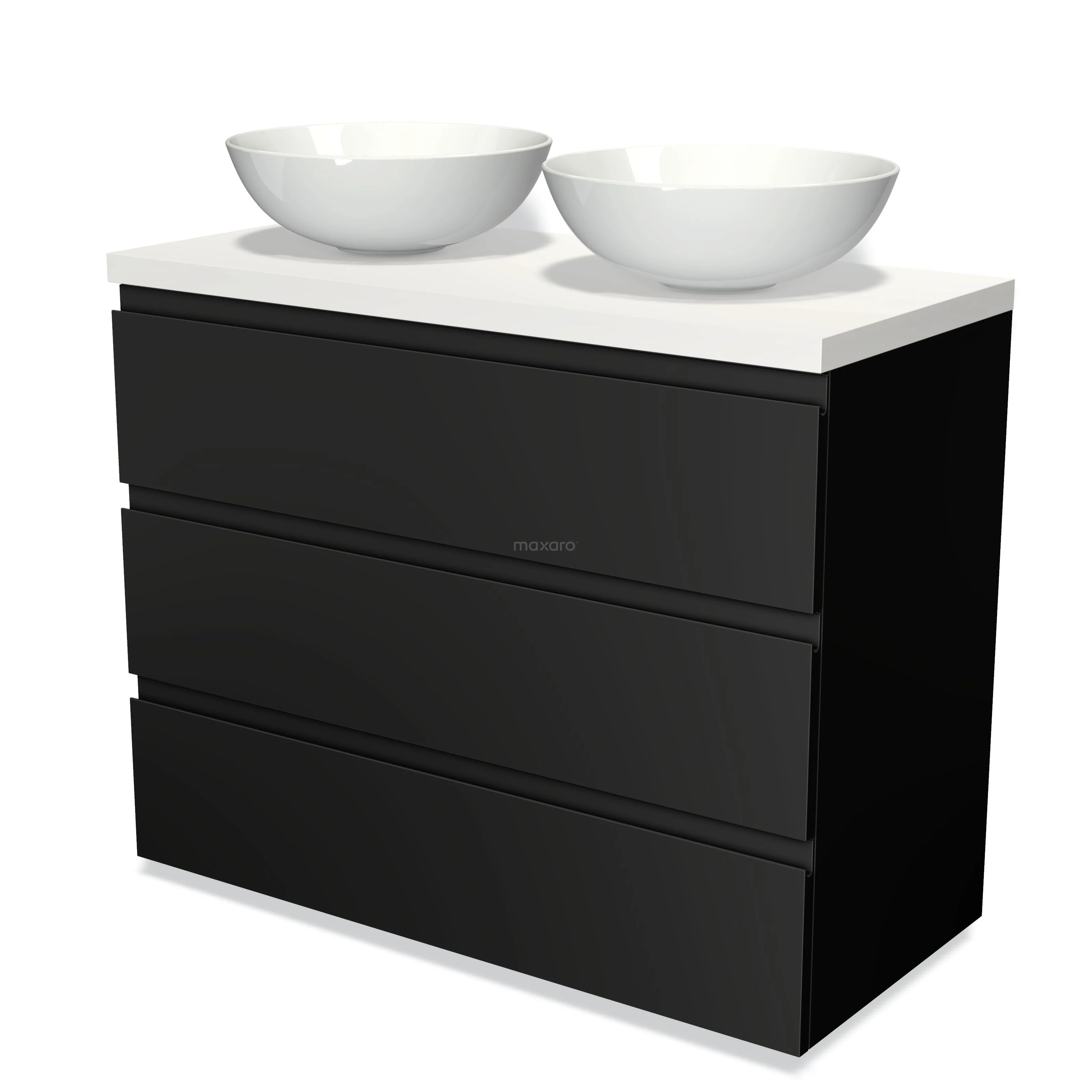 Badmöbel für Waschtischunterschrank mit Konsole 100cm Modulo Plato Matt Schwarz 3 Schubladen Grifflos Matt Weiß Platte