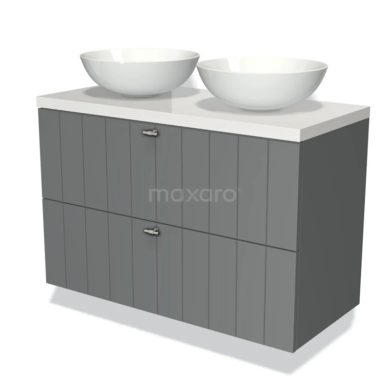 Badmöbel für Waschtischunterschrank mit Konsole 100cm Modulo Plato Mittelgrau 2 Schubladen Latten Hochglanz Weiß Platte