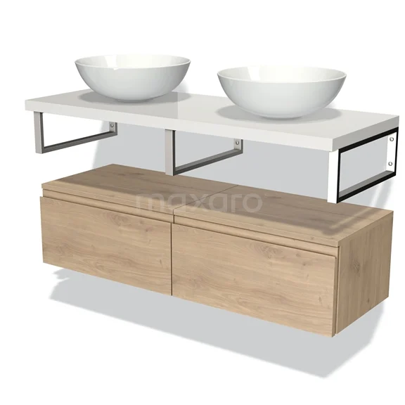 Modulo Plato Badmöbel mit Aufsatzwaschbecken | 120 cm Hellbraune Eiche Grifflos front Hochglanz Weiß blatt Tief hängend