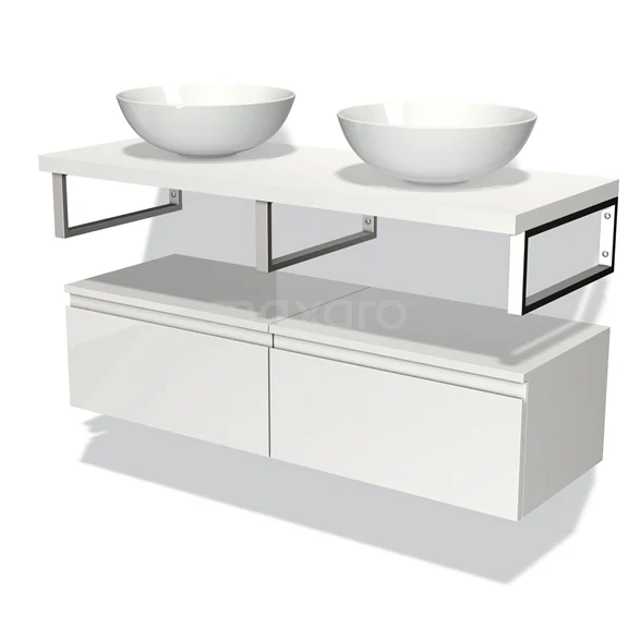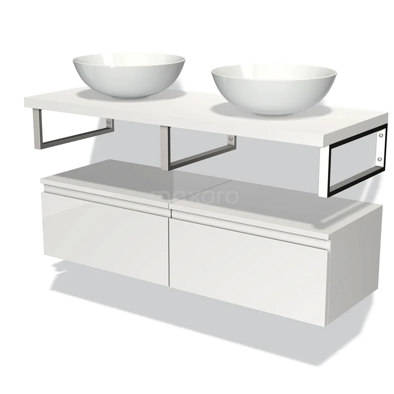Modulo Plato Badmöbel mit Aufsatzwaschbecken | 120 cm Hochglanz Weiß Grifflos front Matt Weiß blatt Tief hängend