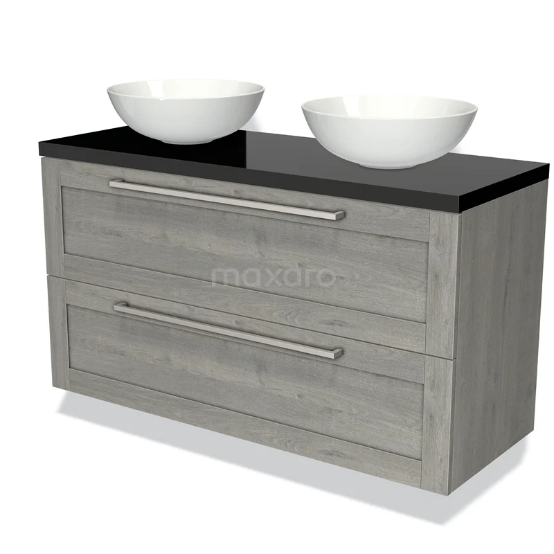 Badmöbel für Waschtischunterschrank mit Konsole 120cm Modulo Plato Graue Eiche 2 Schubladen Rahmen Hochglanz Schwarz Platte